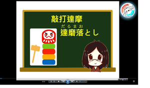 達摩,不倒翁DARUMA,在日本跨越了宗教派別的藩籬,是過年時期許多人喜歡擺設的吉祥物。達摩不倒翁,不論跌倒幾次都會重新站起,這種堅強的意志,象徵著「七轉八起」百折不撓,因此受到人們的尊重和喜愛。敲打達摩遊戲,日文稱為「だるま落とし」,就是把達摩下面幾個不同顏色的圓柱型積木一個一個敲掉,不讓最上面的達摩倒下來的遊戲。讓我們一起來學學看怎麼玩吧!