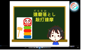 達摩,不倒翁DARUMA,在日本跨越了宗教派別的藩籬,是過年時期許多人喜歡擺設的吉祥物。達摩不倒翁,不論跌倒幾次都會重新站起,這種堅強的意志,象徵著「七轉八起」百折不撓,因此受到人們的尊重和喜愛。敲打達摩遊戲,日文稱為「だるま落とし」,就是把達摩下面幾個不同顏色的圓柱型積木一個一個敲掉,不讓最上面的達摩倒下來的遊戲。讓我們一起來學學看怎麼玩吧!