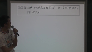 各位同學大家好,接下來我們來例題二。首先 sinθ與cosθ為方程式的兩根,利用兩根和及兩根積來求實數 k 值。