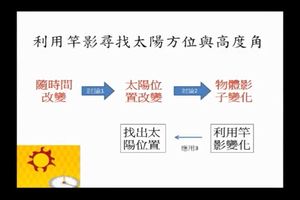 1.利用竿影找出太陽位置。rn2.竿影變化與太陽位置有關係 rn3.利用竿影探究太陽高度角與方位。rn