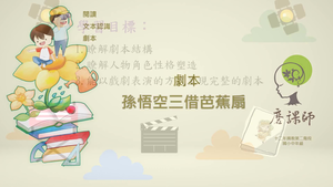 應用文類中,「劇本」的運用十分廣泛,坊間的戲劇無論是兒童劇、傳統戲劇、電視劇等等,演員都必須照著劇本的指示演出,因此劇本格式的認識成為新世代孩子們必須具備的能力之一,唯有認識劇本,才能深入了解戲劇。本教學影片以南一版的〈孫悟空三借芭蕉扇〉為基底,先進行舞臺視角的呈現,再解構成劇本的元素,將劇本以動畫的方式「演」給觀眾看,並期盼學生往後遇到劇本時,也能以戲劇的方式,活潑的將故事表演出來。