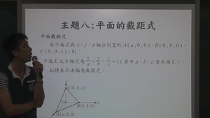 各位同學大家好,今天我們進行下一個主題,平面的截距式。在上一個單元我們已經學習過平面的方程式。這個主題我們要學習的是平面的截距式。首先我們要特別注意的,「截距」指的是座標,不是距離,這點大家要特別注意。