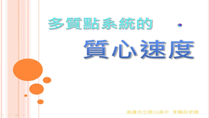 這一堂課的我們要講述的內容是質心速度.如果系統中,每個質點的位置都是固定的,那麼質心的位置當然也是固定不動的.但是,如果系統中有些質點是會運動,那麼系統的質量中心當然會跟著運動,也就是具有「質心速度」,這堂課我們將學會多質點系統質心速度的數學計算式,並了解多質點系統質心速度的意義
