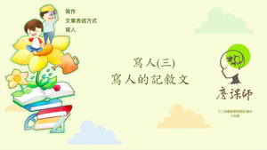 寫人(三)rn領學生學習如何生動、具體、準確使用動詞、分解動作,逐步掌握寫作人物的動作的描寫.rn引領學生學習如何藉由摹寫動作、動作暗示、人物自述逐步掌握刻畫人物的心理rn再透過評量測驗評量學生辨識不同人物形象