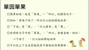 1.舉例:下雨天導致行人撐傘,說明原因「下雨」,結果「行人撐傘」的因果關係rn2.舉課文的段落文章為例,說明事件發生的因果關係。rn