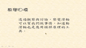 透過觀察與討論,察覺滑輪可以幫我們做事情,知道動滑輪也是應用槓桿原理的工具。