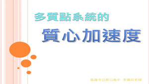 如果我們所討論的系統內的某些質點具有加速度,那麼,看起來,由這些質點所組成的系統,其質量中心也會具有加速度,本課程在使學生了解多質點系統的質心加速度的意義,多質點系統質心加速度的數學計算式.