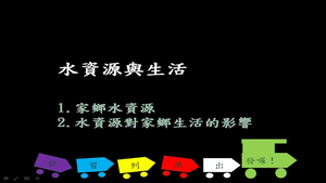 認識家鄉水資源,河川、湖泊、海洋、地下水都是重要的水資源。了解水資源對家鄉生活的影響,臺灣的年平均降雨量約2500公釐,大約是世界平均值的3倍。但是每人每年平均分配水量僅約4000平方公尺,約為世界平均值的1/5。因此臺灣被歸類為─「水資源匱乏地區」。於是,如何節約效率的使用水資源,落實開源節流,是我們必須認真仔細思考的問題。