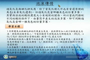 由泡沫傳情實驗得知,過氧化氫與碘化鉀反應,除了當氧化劑之外也有當還原劑的角色(自身氧化還原)。但過氧化氫當哪種角色的份量多寡,其實與溶液的酸性濃度大小有絕對的關係。所以當我們操縱不同的酸性條件下,由量筒中產生的泡沫多寡,即可判斷過氧化氫當哪一種角色的份量多寡。