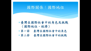 一、 認識臺灣在國際社會中的角色:參與的國際組織、共同關注的全球課題.rn二、 瞭解臺灣在國際社會中面對的挑戰:參加國際組織的困難、全球市場競爭趨勢.