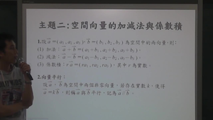 各位同學大家好,接下來我們來看「空間向量的加減法與係數積」。空間向量的加減與平面向量的加減是一樣的,只是多了一個維度z坐標。