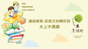 以水上木偶戲這篇記敘文的文章,帶領學生認識轉折詞,以及它在文章句子中的用法。在閱讀時,要找出句子中的轉折詞,並再次閱讀前後文,了解前後文轉折的文意,幫助閱讀理解。影片最後有小試身手的練習,提供即時回饋。
