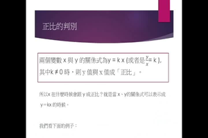 甚麼情況下是正比關係? 甚麼情況下是反比關係?學生常無法分辨。影片透過列出關係式來說明正、反比關係,並舉出正反例子來反覆說明,使學生能明瞭如何判別正、反比。