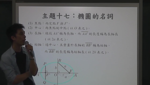 各位同學大家好,今天我們進行下一個主題,橢圓的名詞。在上一個主題我們學習了橢圓的定義。現在我們來看橢圓的名詞介紹。其名詞有著「焦點」、「中心」、「長軸」、「短軸」、「頂點」、「弦」以及「正焦弦」。