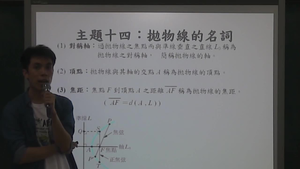 各位同學大家好,今天我們進行下一個主題,拋物線的名詞。在上一個主題我們學習了拋物線的定義。現在我們來看拋物線的名詞介紹。會包含以下幾個專有名詞,「對稱軸」、「頂點」、「焦距」以及「弦」、「焦弦」和「正焦弦」。
