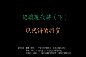 介紹現代詩的四個寫作特質:意象、誇飾、對比、節奏,並舉例說明四個特質在詩中的作用,藉此提升學生鑑賞現代詩的能力。