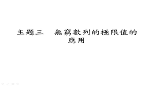 各位同學大家好,今天我們要介紹下一個主題,無窮數列極限值的應用。在上一個主題中,我們已經介紹了無窮數列的極限值。現在我們來看無窮數列的極限可以用在那些應用上。
