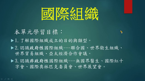 1.了解國際組織成立的目的與類型rn2.認識政府性國際組織---聯合國、世界衛生組織、世界貿易組織、亞太經濟合作會議rn3.認識非政府性國際組織---無國界醫生、國際紅十字會、國際奧林匹克委員會、世界展望會rn