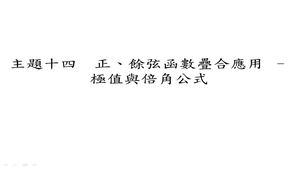 各位同學大家好,今天我們要介紹的是下一個主題,正、餘弦函數疊合應用 – 極值與倍角公式。上一個主題我利用正、餘疊合配合和角公式求出值。今天我們將介紹正餘疊合配合倍角公式求出極值。