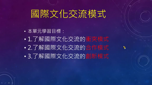 1.了解國際文化交流的衝突模式rn2.了解國際文化交流的合作模式rn3.了解國際文化交流的創新模式rn