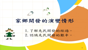 透過觀察、說明及發表,引導學生從家鄉文物中看先民生活方式,了解今昔之不同。家鄉土地開發的人、事、物,包括家鄉的水利興建、居民信仰、教育等。使學生效法先民在開發中艱忍不拔,努力、合作與用心的精神。