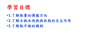 1.了解熱量的傳播方向。rn2.了解溫度對於物體吸熱與放熱的影響。rn3.了解熱平衡的機制。