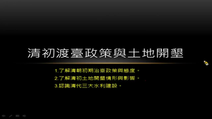1.了解清朝初期治臺政策與態度。rn2.了解清初土地開墾情形與影響。rn3.認識清代三大水利建設。