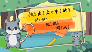認識主角後,透過影片的問思教學與具體操作,置入故事架構—原因、經過與結果模式,引導學生看到故事找主角,找到主角問:主角遇到什麼問題?主角做了什麼?最後結果是什麼?以阿金的長尾巴為例,透過問答教學學習故事架構基模,最後運用「故事梯」概念學習重述故事。