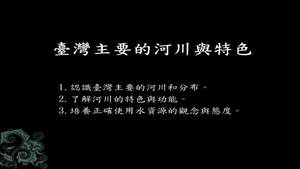 1.透過地圖觀察了解臺灣河川的發源與主要河川的分布,並藉由提問與思考的過程,解臺灣河川的特性。rn2.了解河川的功能以及興建水庫的目的,引導學生培養正確使用水資源的觀念與態度。rn