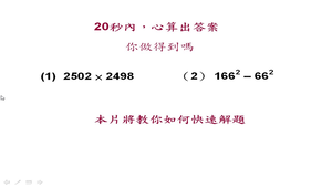 本片主要用分配律與面積來介紹平方差公式,透過動畫,使同學能夠清楚了解「平方差公式」。再用常見的5題例題來說明「差平方公式」的順用與逆用。最後用五題類題的自我練習,讓同學能夠增加印象。