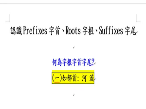 影片簡介: 字首Prefixes (名詞) —認識Prefixes字首、Roots字根、Suffixes字尾前有「動詞」