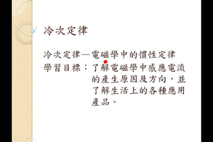 冷次定律rn運用力學中的慣性概念,簡介電磁學中的冷次定律,藉以判斷感應電流產生的原因及方向,透過立體空間的圖形,使學生明確了解感應電流在磁場移動下的變化,並藉由小測驗了解學生是否確實理解冷次定律的應用。rn
