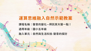 〈聲音的變化─拜託笑大聲一點!〉單元嘗試將運算思維的概念融合國小五年級〈自然與生活科技─聲音的探討〉單元進行教學設計。影片內容依照運算思維的「解構」、「通則化」、「抽象化」及「演算法」元素加以剪輯,從探討影響聲音大小的因素、力道大小施加於不同物體所產生的聲響變化[解構]開始,讓學生體會聲音大小與物體震動之間的關係;接著引導學生歸納前一階段的觀察,建構一般性原則[通則化];再使用分貝計量,並判斷讀數與音量大小之間的關係[抽象化];最後導入程式語言中的「if…then…」語法,設計一個說笑話評分系統的回饋方式,並透過同儕討論的方式對各種演算法進行評估與修正[演算法]。