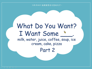 食物-What do you want? I want I want some milk/water/juice/coffee/soup/ice cream/cake/pizza.