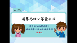 本教材由教育部委辦計畫「運算思維教材開發計畫-數學領域」開發,課程內容主要為九年一貫國小六年級(十二年國教七年級)數學-等量公理單元概念為主,影片內容主要引導教師使用Scratch融入數學教材之使用方法,可搭配教育大市集課程包使用。