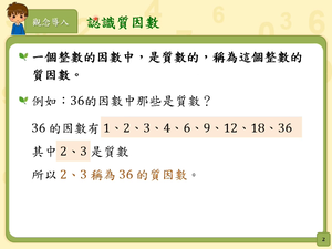 學習內容:N-6-1 20以內的質數和質因數分解:小於20的質數與合數。2、3、5的質因數判別法。以短除法做質因數的分解。