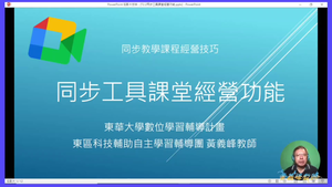 同步教學課程經營技巧–同步工具課堂經營功能,(如:視訊、即時通訊、舉手、白板等互動功能)、雲端硬碟空間繳交作業等。