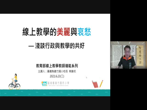 此次課程「線上教學的美麗與哀愁-淺談行政與教學」主講者為嘉義縣義竹國小蔡鎮名校長,校長在課堂一開始先分享自身學校從停課開始所做的應變措施,接著也分享了嘉義縣在停課不停學這段期間所做的努力。校長在課程中也提供許多嘉義縣的應變作為:組織縣府停課小組、分流解決視訊系統服務、弱勢家戶的網路支持等。除了這些之外,也設計出居家學習的參考指引,讓老師、學生及家長知道就算停課在家學習,也是有方法可循,不會盲目、不知所從。另外,校長提供在暑假前及暑假中學校行政人員及授課老師幾個方面的作法,使學生不會因為放暑假而荒廢學業,也分享了許多在視訊教學時可以使用什麼軟體及網頁來吸引學生的注意。