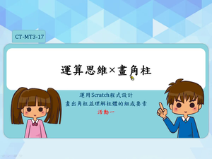 本教材由教育部委辦計畫「運算思維教材開發計畫-數學領域」開發,課程內容主要為五年級數學-柱體與椎體的概念為主,影片內容主要引導教師使⽤Scratch融入數學教材之使⽤⽅法,可搭配教育⼤市集課程包使⽤。