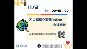 課程內容:本場次線上教學教師增能課程邀請到高雄市瑞祥國小宋宗樺教務主任擔任講師,主要在介紹全球素養(Global Competence, GC)概念解說與教材介紹,以及因材網21世紀核心素養系統介紹與實作練習。全球素養核心內容大致上分四個面向:當面對全球議題時,能有效整合世界性知識與批判性思維,以建構自我觀點;強調能從多元角度考量全球議題及他人觀點與行為;當面臨不同文化時,能夠採取開放、適當且有效的方式進行互動;為集體福祉及永續發展而行動,建立更公正、和平、包容和環境永續的世界。講師除了講解基本素養的內容,還在課堂上介紹因材網的核心素養系統也帶著大家做實作的練習,讓與會的老師們覺得意猶未盡,都希望能夠加長研習的時間。