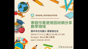 課程內容:本次線上教學增能研習,為寒假作業使用因材網分享系列之一,邀請臺中市北屯國小葉晉源主任擔任講師,以數學領域為主題。內容涵蓋教師端與行政端如何引起學生使用因材網之動機,運用因材網及免登入居家線上學習資源網頁規劃寒假作業分享如何使用組卷相關功能,且學校端如何提供家長因材網之相關資訊,如;研習、操作說明書、帳號之配置等。