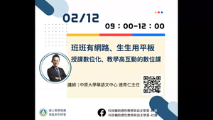 課程內容:本場次線上教學教師增能研習邀請到中原大學華語文中心連育仁主任擔任講師,分享2022年的教育趨勢以及應變方式,如何配合政府推動中小學數位學習精進方案,達成更完善的數位教學。在課堂上利用互動式電子白板操作與數位教材整合讓課程更加流暢順利,介紹行動裝置在課堂上能發揮的最大效益以及平板電腦中的教學工具與實際操作,是後疫情、新常態不可或缺的數位教學力。