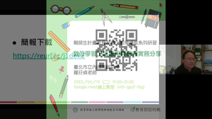 課程內容:本場次邀請台北市內湖高中羅玗貞教師擔任講師,羅教師分享許多線上平台資源,除了因材網以外,還介紹了Google Jamboard、 Google 簡報互動工具PearDeck等工具,有使用白板功能作畫,也有創作音樂的小工具,讓課程變得有趣不乏味,最後老師利用一點時間分享臺北市內湖高中推動平板教學成果,此次因介紹的較多,許多應用無法詳細的介紹,卻也多少有提及,讓教師有更多線上教學資源的選擇。