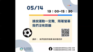 課程內容:本場次線上教學教師增能研習邀請到臺北市北投國中蘇詩媚老師擔任講師,此次研習分享的主題是線上體育課,疫情期間該怎麼上體育課?相信這是很多老師們苦惱的問題,詩媚老師藉由自身的教學經驗,分享一些她自己線上上課的方式,希望能幫助更多老師們找到合適的教學方式。利用孩子們愛玩的特性設計一系列有趣的活動,課程內容設計也配合不同年齡層以及班級特性做調整,透過老師用心設計的課程,融入人文素養的教學,更讓孩子們從體育著眼放眼世界,完全是跨領域的素養課程,深受與會老師們的推崇。