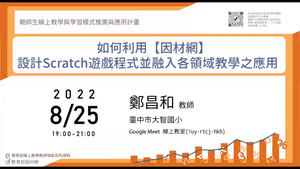 本場次線上教學教師增能研習邀請到臺中市大智國小鄭昌和老師擔任講師。此次鄭老師藉由因材網資訊設計課程講解Scratch,從註冊開始,依序講解介面、指令、編碼,並以因材網的資訊課程分享如何將Scratch應用於課堂,研習過程擔心與會教師無法跟上演示速度,鄭老師不停提醒可以自行觀看因材網課程進行自學,不僅是教師 ,學生如有興趣,也能利用相關教學資源增添新能力。