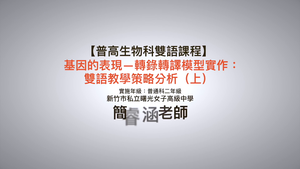 學生透過實作學習基因轉錄、轉譯的概念,本 1.2 影片分析該課程中所使用到的雙語教學策略。教師在暖身階段引起學習動機,再用學習單解釋教學重點,以英文講解搭配中文板書。接著,以異質分組讓學生互相協助應用所學,教師也運用多模態教材呈現重點概念。實作過程中,教師和各組確認理解,同時提醒常見錯誤,實作結束後,呈現學生的作品,隨後進行複習及評量,檢視學習成果與練習口說表達。