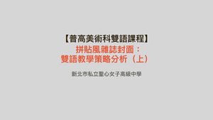 本次課程為拼貼風格雜誌實作。本影片分析教師在課堂中所使用的雙語教學策略。教師在課程中帶領學生利用超現實主義的創作手法— 拼貼,並結合英文元素,讓學生進行實作。在課程一開始,美術教師便與英文教師確認學生的英文準備度,使課程中所使用的英文單字能符應學生的學習能力。教師課堂進行過程不論是課室指令語、名詞解釋或是工作步驟,都得當運用英文,使學生在課堂中逐漸習慣英文的元素。