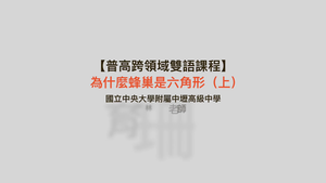 本課程從「蜜蜂的蜂巢為何是六邊形?」這個科普議題切入,並融入相關學科概念,屬於議題式引導的課程。第一節課先以蜜蜂蜂巢為何是六邊形這個問題,引發學生的好奇心,並請學生分組討論,提出小組的假設與證據支持,接著運用英文科普閱讀素材,介紹蜜蜂如何建構蜂巢,引導學生思考何種圖形的蜂巢面積最大。由此融入數學學科並介紹數學鑲嵌概念,請學生從數學的角度找出鑲嵌與圖形最大面積的交集。