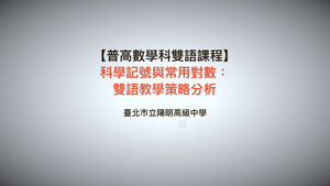 本影片內容先介紹雙語課程「科學記號與常用對數」的教案設計理念,並說明為何如此安排以及相關教學策略,最後以整體雙語教學實行困境與心得進行總結。