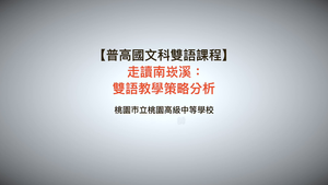 「走讀南崁溪」是桃園高中校訂必修課「發現虎崗」的國文領域課程,課程包含戶外踏查、有關南崁溪的影音報導、詩歌創作和地景藝術。本影片聚焦於課程中的第1、2節,內容取材自文學繪本,採用任務導向學習的方式,讓學生分組報告。針對課堂講解,教師強調不能弱化本科內容,不拘泥雙語運用比例,教學過程中除了使用中文也融入課室英語,,透過英文對話和上臺報告,幫助學生練習口語表達,結合學科與語言的多元學習。最後,教師分享雙語教學的心路歷程與感想。